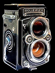 This is a TLR camera. As its name defines that Twin Lens Reflex Camera consist of two lens of same focal length, upper one to view from the viewfinder and lower one to capture the image on the film. These camera were remain in trend for long time and gave birth to Candid photography, which was very easy with TLR Camera as subject was not much aware of the camera. These camera were remain in trend for a long time.